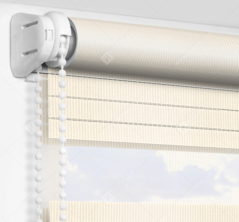 Рулонные шторы Зебра работают следующим образом: полоски ткани смещаются так, чтобы совпали светлые или темные слои, образуя, плотное или более прозрачное полотно. Так обеспечивается ночной или дневной режим затемнения. Также можно поднять шторное полотно полностью, открывая окно. По умолчанию - цвет фурнитуры белый.