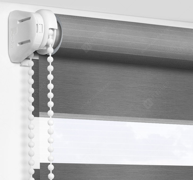 Рулонные шторы Зебра работают следующим образом: полоски ткани смещаются так, чтобы совпали светлые или темные слои, образуя, плотное или более прозрачное полотно. Так обеспечивается ночной или дневной режим затемнения. Также можно поднять шторное полотно полностью, открывая окно. По умолчанию - цвет фурнитуры белый.